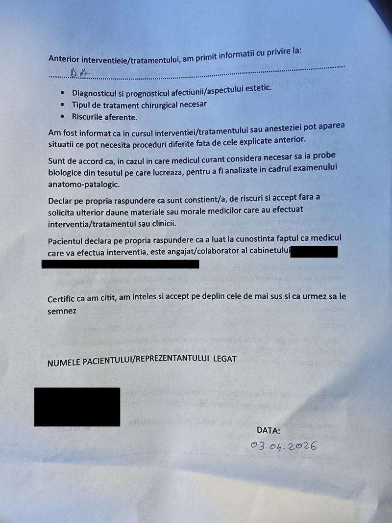 De asemenea, documentul prevede că, în timpul intervenției sau al anesteziei, pot apărea situații neprevăzute care să necesite proceduri diferite față de cele explicate inițial.