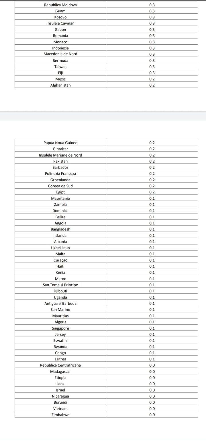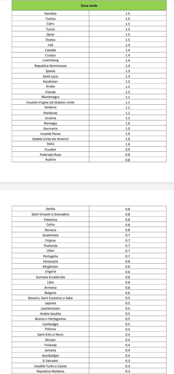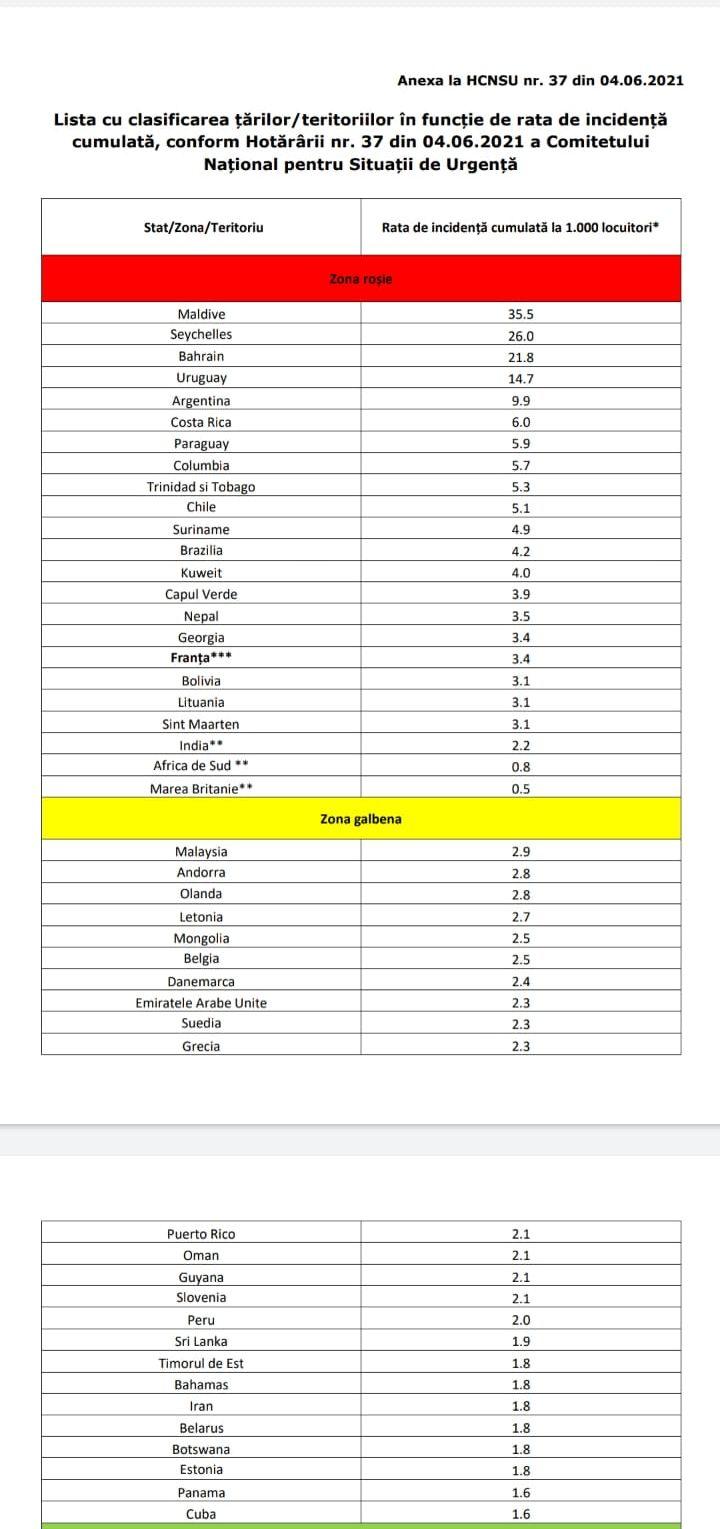"Se aprobă clasificarea ţărilor/teritoriilor în funcţie de rata de incidenţă cumulată, în vederea stabilirii persoanelor care sosesc în România din acestea şi cu privire la care se instituie măsura carantinei, prevăzută în anexă la prezenta hotărâre", se arată în hotărârea nr. 37 a CNSU.