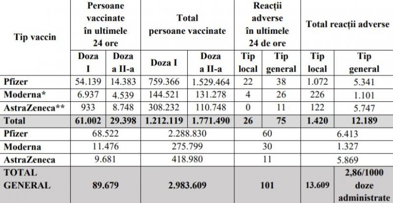 Potrivit datelor puse la dispoziția Comitetului Național de Coordonare a Activităților privind Vaccinarea împotriva COVID-19 (CNCAV) de către Institutul Național de Sănătate Publică (INSPCNSCBT), prin aplicația Registrul Electronic Național al Vaccinărilor (RENV), care ține evidența vaccinărilor, situația din ziua de 24 aprilie a.c., ora 17.00, este următoarea:
