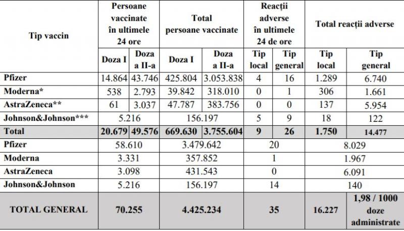 Potrivit datelor puse la dispoziția Comitetului Național de Coordonare a Activităților privind Vaccinarea împotriva COVID-19 (CNCAV) de către Institutul Național de Sănătate Publică (INSP-CNSCBT), prin aplicația Registrul Electronic Național al Vaccinărilor (RENV), care ține evidența vaccinărilor, situația din ziua de 5 iunie a.c., ora 17.00, este următoarea: