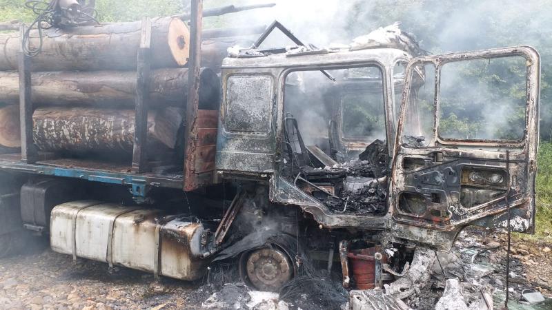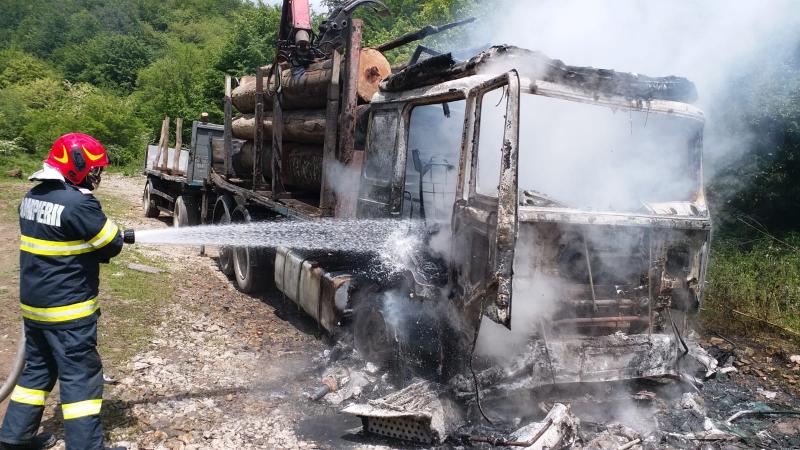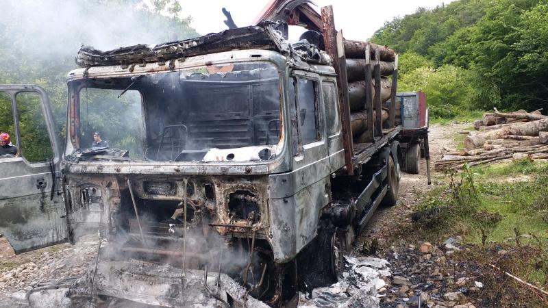 Camion ce transporta lemne tăiate, făcut scrum în urma unui incediu