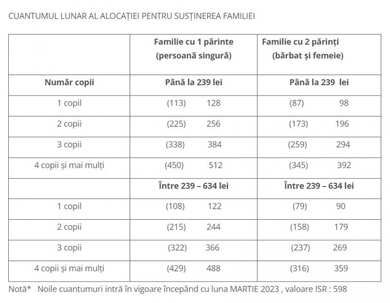 Cuantumul alocației pentru susținerea familiei poate fi calculat conform tabelului de mai jos, ținând cont de veniturile nete pe membru de familie și de numărul de copii.