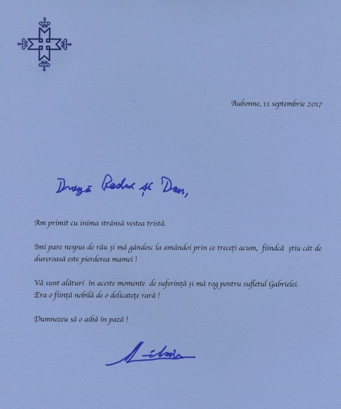 "Îmi pare nespus de rău şi mă gândesc la amândoi prin ce treceţi acum, fiindcă ştiu cât de dureroasă este pierderea mamei. Vă sunt alături în aceste momente de suferinţă şi mă rog pentru sufletul Gabrielei. Era o fiinţă nobilă, de o delicateţe rară", este scrisoarea semnată de regele Mihai şi adresată principelui Radu şi fratelui acestuia, Dan.