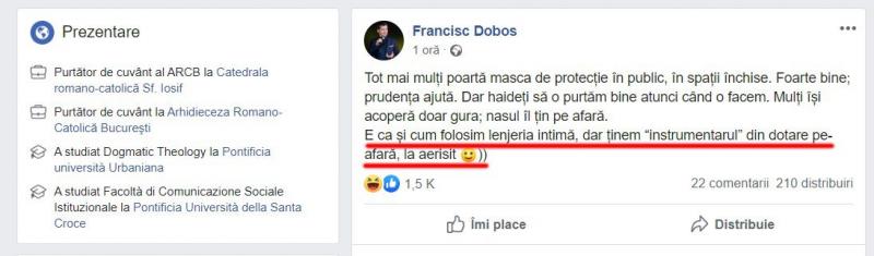 Cu o zi înainte de înlocuirea lui, Preotul Francisc Doboş postase pe pagina de Facebook un mesaj controversat legat de modul în care unele persoane folosesc măştile de protecţie în public.