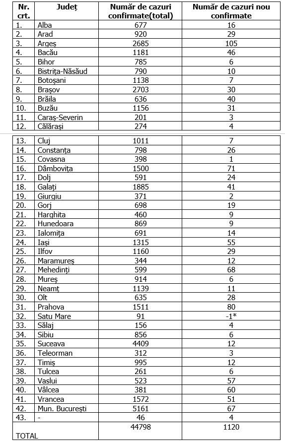 Până astăzi, 26 iulie, pe teritoriul României, au fost confirmate 44.798 de cazuri de persoane infectate cu noul coronavirus (COVID – 19).