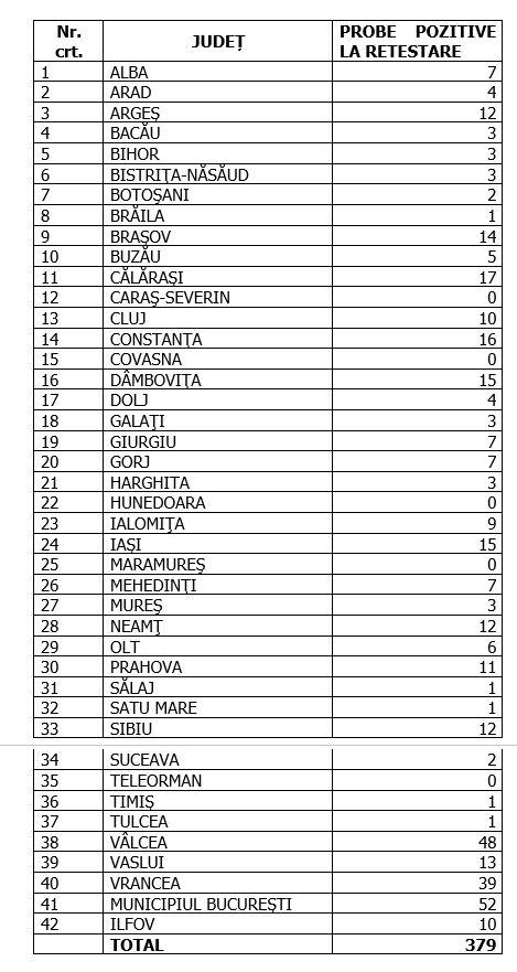 Distinct de cazurile nou confirmate, în urma retestării pacienților care erau deja pozitivi, 379 de persoane au fost reconfirmate pozitiv. Distribuția pe județe a acestor cazuri o regăsiți în tabelul de mai jos.