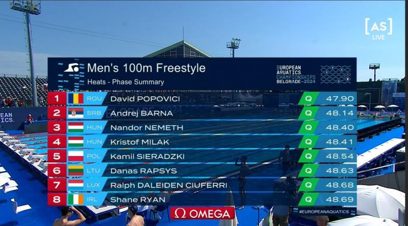 UPDATE 10:55 David Popovici a câştigat fără probleme seria sa, cu timpul 47.90, fiind de altfel şi cel mai bun timp dintre toate seriile. Semifinala este astăzi, 20:03, live în AntenaPLAY.