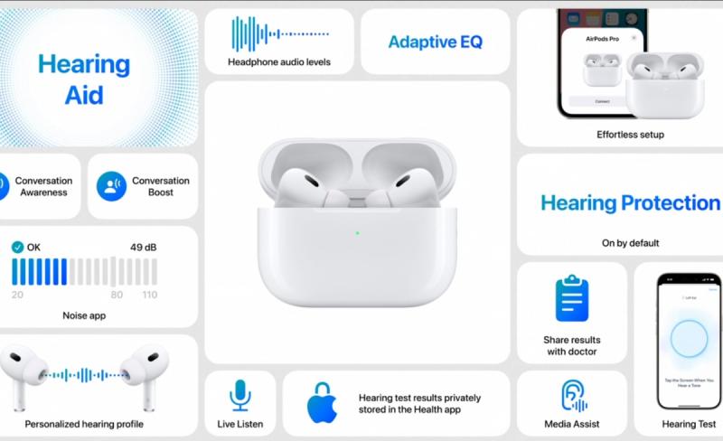 Trei puncte au fost evidențiate pentru actualizările AirPods Pro 2: prevenirea, conștientizarea și asistența. Pentru prevenire, protecția auditivă va fi adăugată și activată implicit pentru reducerea pasivă a zgomotului, gestionată prin învățare automată. Pentru conștientizare, Apple adaugă un test auditiv „validat clinic” pe care proprietarii îl pot efectua în orice moment.