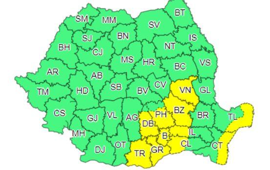 Atenţionarea vizează Capitala și județele Teleorman, Giurgiu, Dâmbovița, Călărași, Ialomița, Buzău, Prahova, Vrancea, Constanța și Tulcea. Intensificări ale vântului vor mai fi, temporar, și în restul zonelor din sud și est, cu viteze în general de 45...50 km/h.