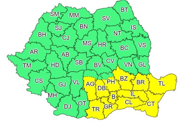 Codul galben de furtuni este în vigoare în intervalul 26 septembrie, ora 10.00 – 27 septembrie, ora 21.00. Potrivit meteorlogilor, marți și miercuri (26 și 27 septembrie), vântul va avea intensificări temporare în Dobrogea și Muntenia, cu viteze de 55...65 km/h, iar pe litoral și în bazinul vestic al Mării Negre rafalele vor depăși 70 km/h.