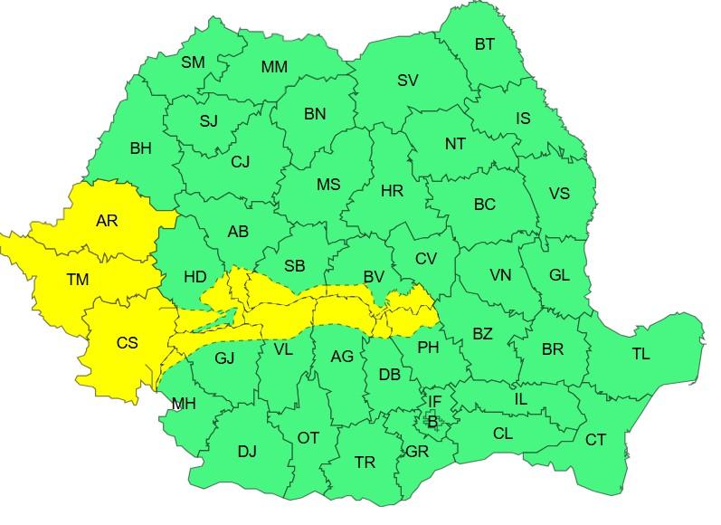 Judeţele Arad, Timiş şi Caraş-Severin se vor afla în totalitate sub cod galben, iar parţial judeţele: Hunedoara, Mehedinţi, Alba, Gorj, Sibiu, Vâlcea, Braşov, Argeş, Dâmboviţa şi Prahova.