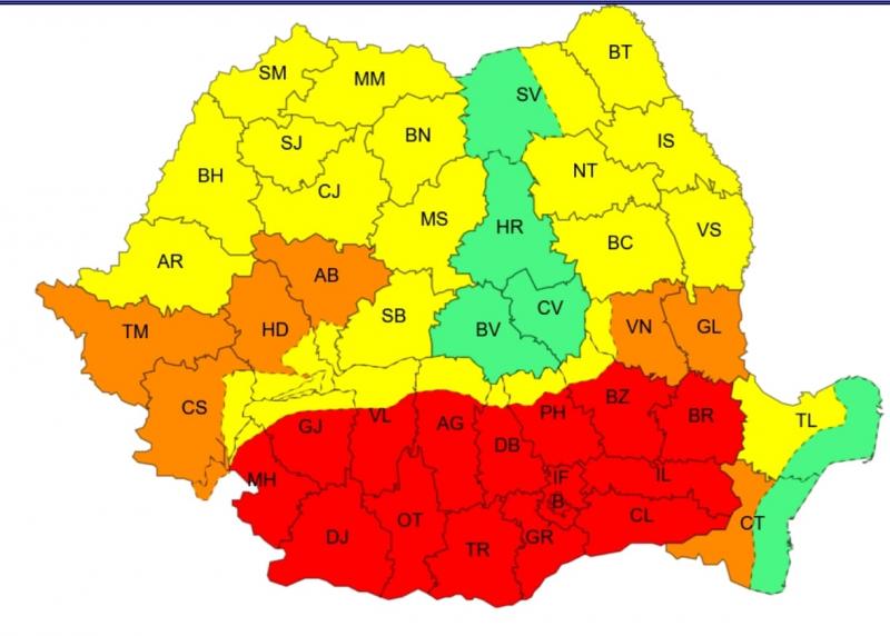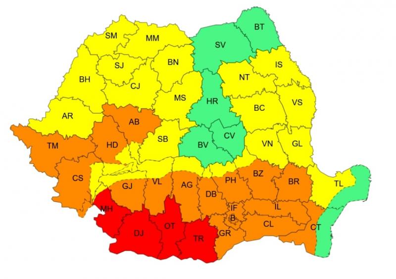 Potrivit ANM, în intervalul 6 iulie, ora 10 – 7 iulie, ora 10, codul roşu pune stăpânire pe județele Mehedinți, Dolj, Olt și Teleorman. Fenomenele vizate sunt val de căldură intens și persistent, caniculă, disconfort termic deosebit de accentuat, noapte tropical.