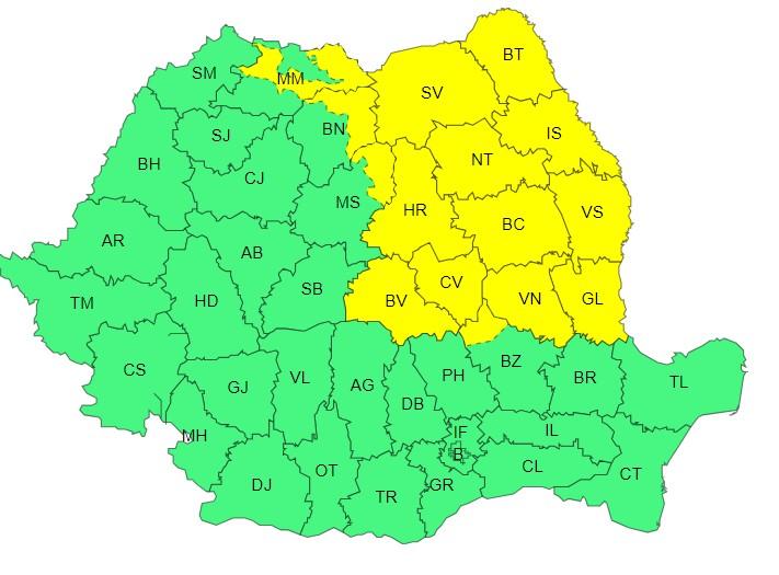 Alerta meteo vizează judeţele: Bacău, Covasna, Mureş, Bistrița-Năsăud, Galaţi, Neamţ, Botoşani, Harghita, Suceava, Braşov, Iaşi, Vrancea, Buzou, Maramureş şi Vaslui.