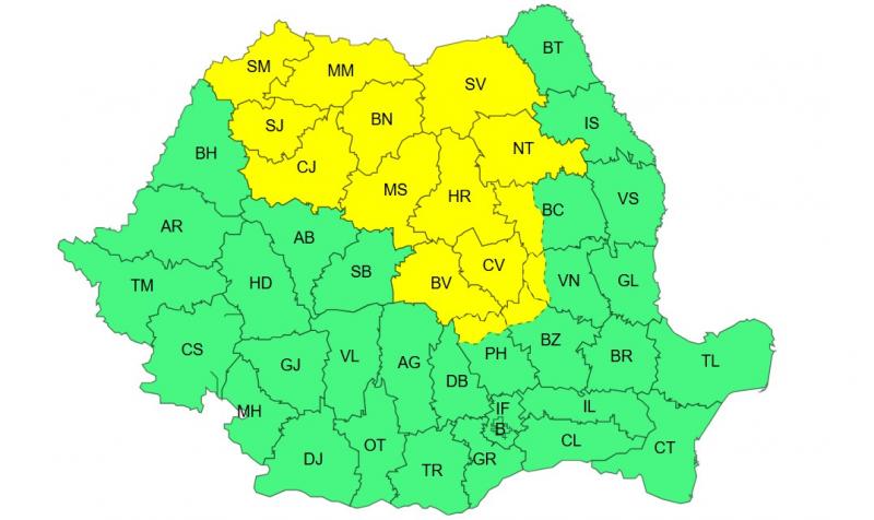 În Maramureș, cea mai mare parte a Transilvaniei, în nord-vestul Moldovei și local la munte vor fi perioade cu instabilitate atmosferică, ce se va manifesta prin averse torențiale, descărcări electrice,