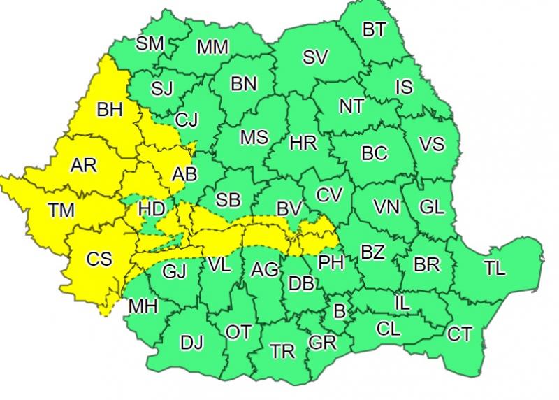 Astfel, în intervalul marți, ora 10.00 - miercuri, ora 3.00, vântul va avea intensificări în Banat și în Crișana, precum și în Carpații Occidentali și în Carpații Meridionali cu viteze în general de 55...65 km/h. La altitudini de peste 1700 m, vor fi rafale de 80...100 km/h.