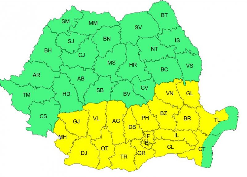 Sunt vizate județele Gorj, Mehedinți, Dolj, Vâlcea, Olt, Argeș, Teleorman, Giurgiu, Dâmbovița, Prahova, Călărași, Ialomița, Constanța, Tulcea, Brăila, Buzău, Galați, Vrancea, Ilfov și Capitala. Avertizarea este în vigoare miercuri între orele 12.00 și 21.00.