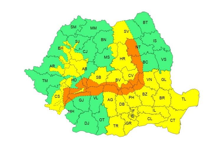 În această dimineaţă a intrat în vigoare un cod portocaliu de ninsori abundente, depunere de strat de zăpadă și viscol puternic la altitudini în general de peste 1700 m.