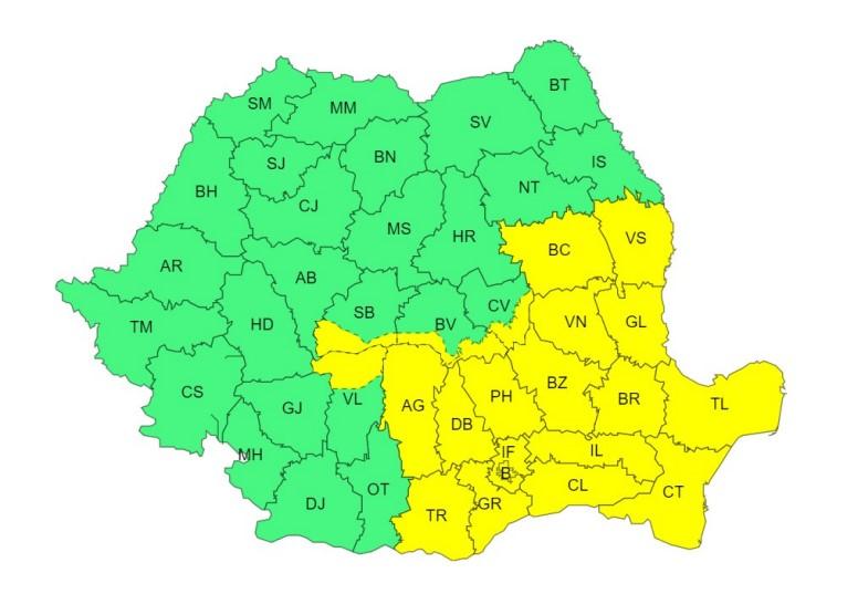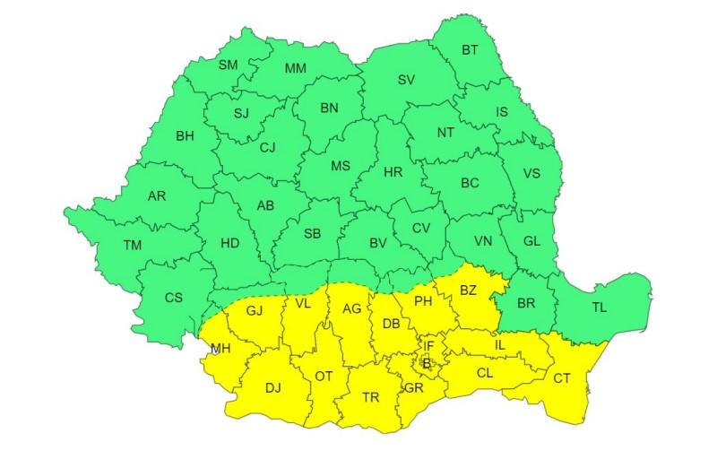 În Muntenia, Dobrogea, precum și în centrul și sudul Moldovei vântul va avea intensificări, cu rafale de 50...70 km/h și temporar de 75...80 km/h în estul Munteniei și pe litoral.