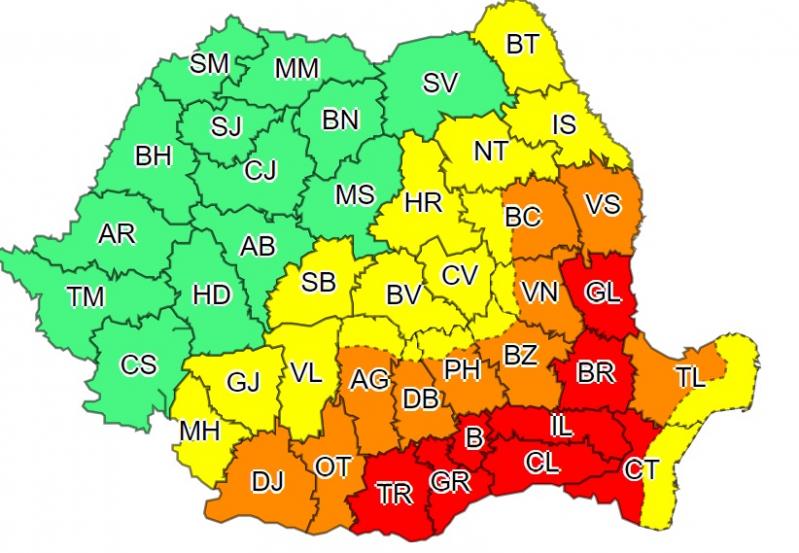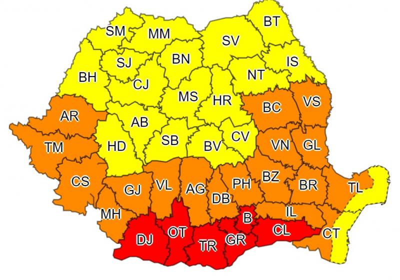 În județele Teleorman, Giurgiu, Ilfov, Călărași, Ialomița, Brăila, Galați, vestul județului Constanța și în municipiul București se vor înregistra temperaturi maxime extreme de 40...42 de grade, iar disconfortul termic va fi deosebit de accentuat.