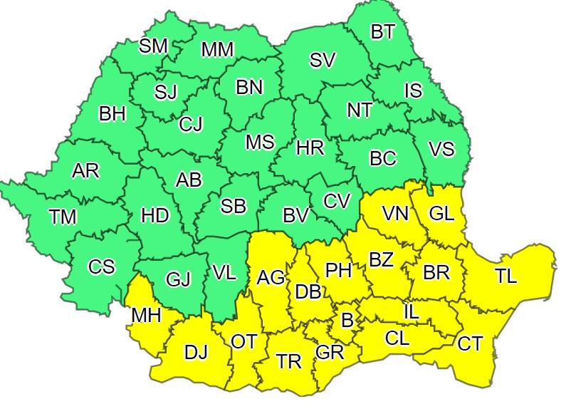 Avertizarea vizează Capitala și județele Prahova, Dâmbovița, Argeș, Dolj, Mehedinți, Vrancea, Galați, Buzău, Brăila, Tulcea, Ialomița, Constanța, Ilfov, Călărași, Giurgiu, Teleorman, Ilfov și Olt.