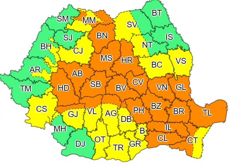 Avertizarea cod portocaliu vizează județele Maramureș, Bistrița-Năsăud, Mureș, Harghita, Covasna, Hunedoara, Alba, Sibiu, Brașov, Vrancea, Galați, Buzău, Brăila, Gorj, Vâlcea, Argeș, Dâmbovița, Prahova, Ialomița, Călărași, Tulcea și Constanța.