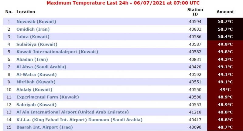 În zona Sweihan din Emiratele Arabe Unite a fost înregistrată o temperatura record de 51.8°C (125.2°F). Acest lucru este egal cu recordul național din iulie 2017 și, prin urmare, stabilește un nou record de căldură pentru luna iunie.