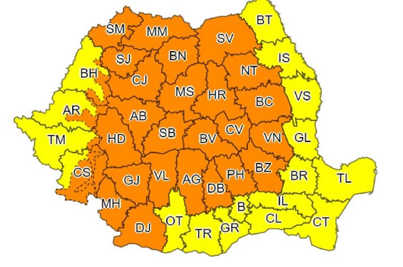 - Meteorologii anunță că de vineri, de la ora 23.00 până duminică la ora 6.00, aproape toată țara este sub cod portocaliu de ploi, vijelii și grindină.