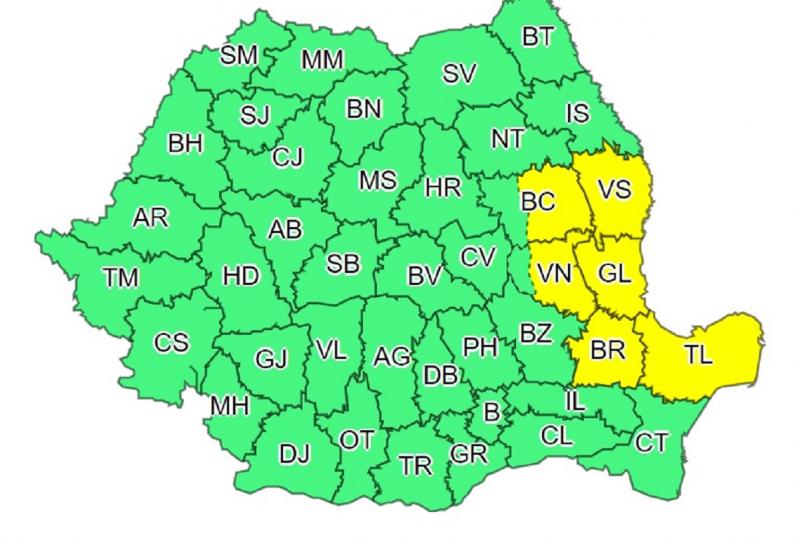 - Codul galben de vânt este valabil în Bacău, Vaslui, Vrancea, Galați, Brăila și Tulcea.