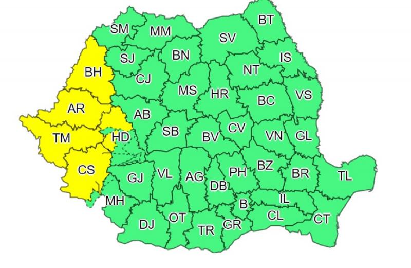 Astfel, potrivit meteorologilor ANM, în intervalul miercuri ora 15:00 – joi ora 2:00, în județele Bihor, Arad, Hunedoara, Timiș și Caraș-Severin vor fi perioade cu instabilitate atmosferică, ce se va manifesta prin averse ce vor avea și caracter torențial, descărcări electrice, intensificări de scurtă durată ale vântului și vijelii.