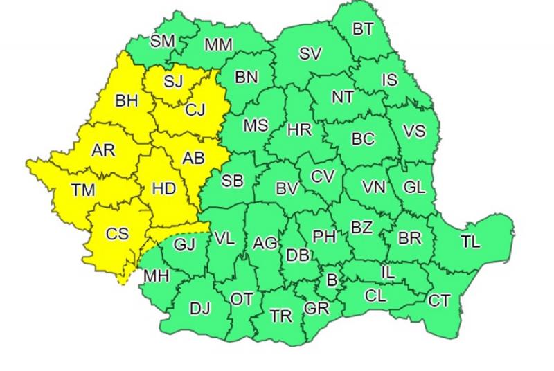 Avertizarea vizează județele Sălaj, Cluj, Bihor, Alba, Arad, Hunedoara, Timiș, Caraș Severin și parțial Mehedinți și Gorj.