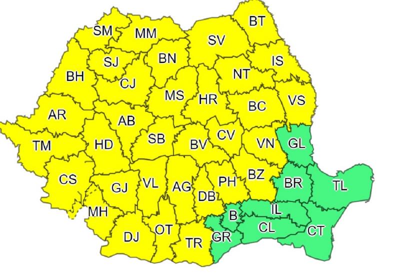 Meteorologii ANM au emis două avertizări cod galben de ploi torențiale, vijelii și grindină. Prima alertă vizează zece județe, iar cea de-a doua 33 de județe.