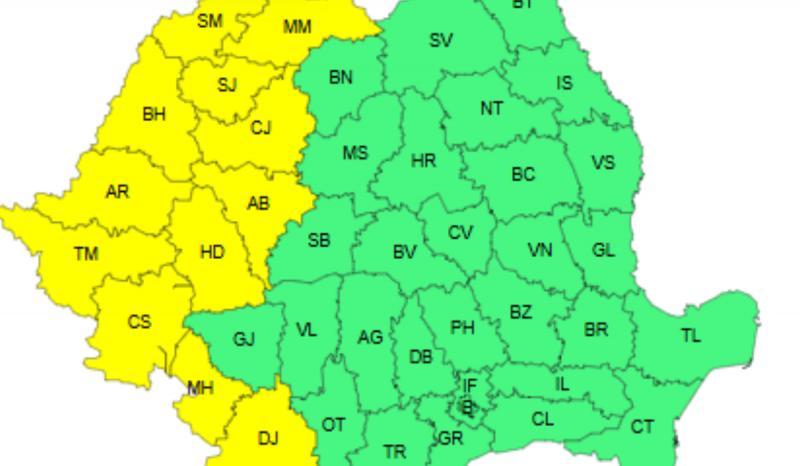 Potrivit ANM, miercuri, între 12 şi 21, este cod galben de caniculă în Maramureş, Crişana, Banat, vestul Transilvaniei şi sud-vestul Olteniei. "Vor fi temperaturi deosebit de ridicate, local caniculă şidisconfort termic ridicat, iar indicele temperatură-umezeală (ITU) va depăşi uşor pragul critic de 80 de unităţi. Temperaturile maxime vor fi cuprinse între 33 şi 36 de grade, cu cele mai ridicate valori în regiunile vestice", anunţă meteorologii.