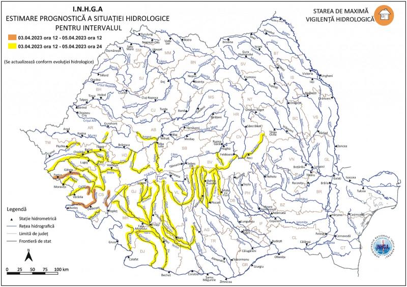 Institutul Naţional de Hidrologie şi Gospodărire a Apelor anunță scurgeri importante pe versanţi, torenţi şi pâraie, viituri rapide pe râurile mici cu posibile efecte de inundaţii locale şi creşteri de debite şi niveluri pe unele râuri din bazinele hidrografice Mureş, Bega Veche, Bega, Timiş, Bârzava, Moraviţa, Caraş, Nera, Cerna, Dunăre – afluenţii mici aferenţi sectorului amonte confluenţă Desnăţui, Desnăţui, Jiu, Olt, cu posibile depăşiri ale cotelor de apărare. De luni ora 12.00 până miercuri ora 24.00 este cod galben pe râuri din Alba, Sibiu, Hunedoara, Arad, Timiş, Caraş Severin, Gorj, Covasna şi Braşov.
