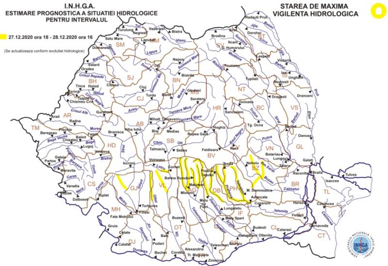 Potrivit avertizării INGHA, fenomenele se pot produce cu probabilitate și intensitate mai mare ȋn intervalul 28.12.2020 ora 06:00 – 28.12.2020 ora 12:00, pe unele râuri din Prahova şi Buzău.