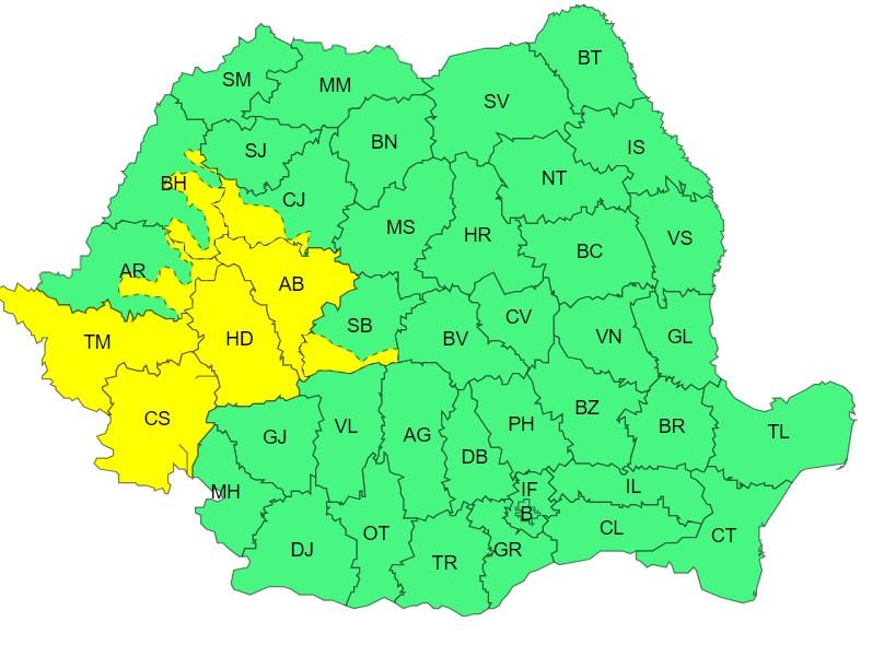 Astfel, de la ora 12.00 intră în vigoare un cod galben de ploi torențiale și descărcări electrice în Carpații Occidentali, vestul Carpaților Meridionali, sud-vestul Transilvaniei și local în Banat. Potrivit ANM, joi, între orele 12.00 şi 23.00, vor fi perioade cu instabilitate atmosferică accentuată care se va manifesta prin averse torenţiale şi pe arii restrânse descărcări electrice. Fenomenele periculoase se vor semnala în Carpaţii Occidentali, vestul Carpaţilor Meridionali, sud-vestul Transilvaniei şi local în Banat.