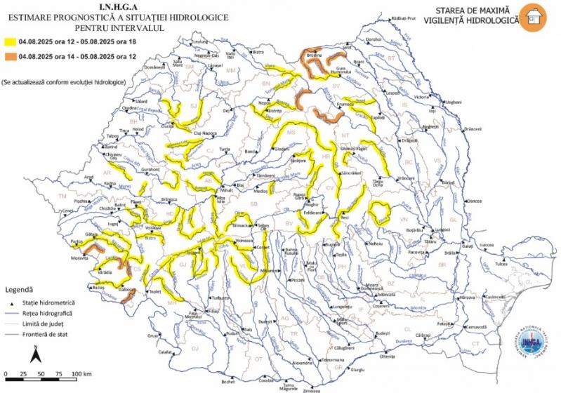 În intervalul 04.08.2025 ora 14:00 – 04.08.2025 ora 24:00 pe râurile din bazinele hidrografice: Suceava – bazin superior şi afluenţi bazin mijlociu şi inferior, Moldova – bazin amonte S.H. Fundu Moldovei şi afluenţii aferenţi sectorului aval S.H. Fundu Moldovei – amonte confluenţă cu râul Râşca (judeţul Suceava), Bistriţa – afluenţii aferenţi sectorului aval S.H. Dorna Giumalău – amonte Ac. Izvoru Muntelui (judeţele: Suceava, Harghita şi Neamţ). În intervalul 04.08.2025 ora 23:00 – 05.08.2025 ora 12:00 pe râurile din bazinele hidrografice: Moraviţa (judeţele: Caraş Severin şi Timiş), Caraş – bazin superior şi afluenţi bazin mijlociu şi inferior, Nera – bazin superior şi afluenţi bazin mijlociu şi inferior (judeţul Caraş Severin), Dunăre – afluenţii mici aferenţi sectorului amonte confluenţă cu râul Cerna (judeţele: Mehedinţi şi Caraş Severin).