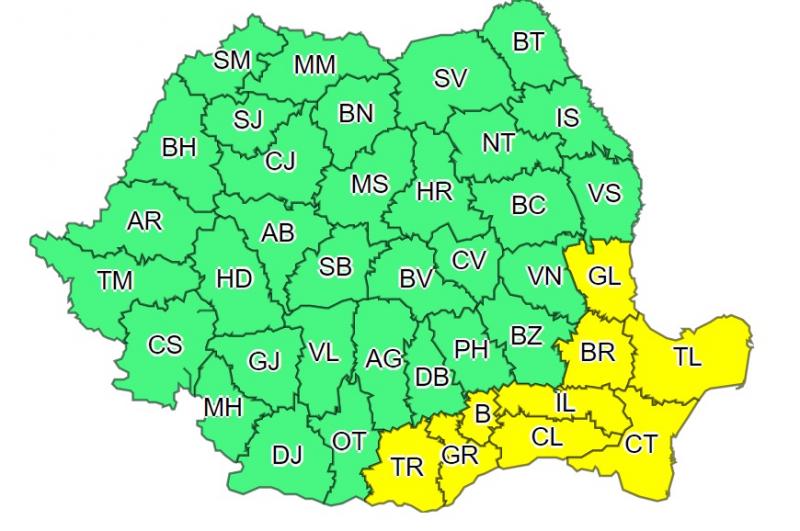 Administraţia Naţională de Meteorologie a emis a avertizare cod galben de ninsori însemnate cantitativ în jumătatea de sud-est și viscolite în Dobrogea, estul Munteniei și sud-estul Moldovei.
