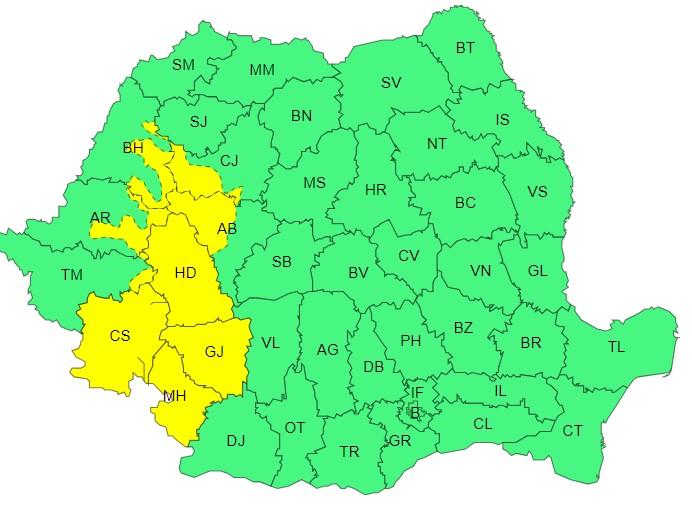 Administraţia Naţională de Meteorologie a emis o avertizare cod galben de ploi valabilă marți în nouă județe din țară. Potrivit ANM, sunt vizate parțial sau total județele Cluj, Bihor, Alba, Arad, Hunedoara, Timiș, Caraș-Severin, Dolj și Mehedinți.