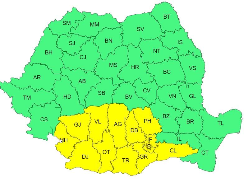 Va fi cod galben în judeţele Bacău, Brăila, Botoşani, Călăraşi, Constanţa, Galaţi, Ialomiţa, Iaşi, Neamţ, Suceava, Tulcea, Vrancea şi Vaslui.