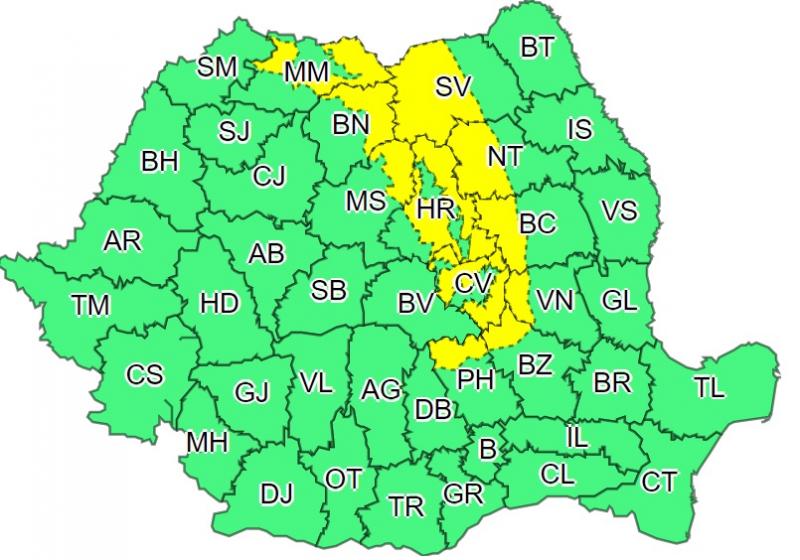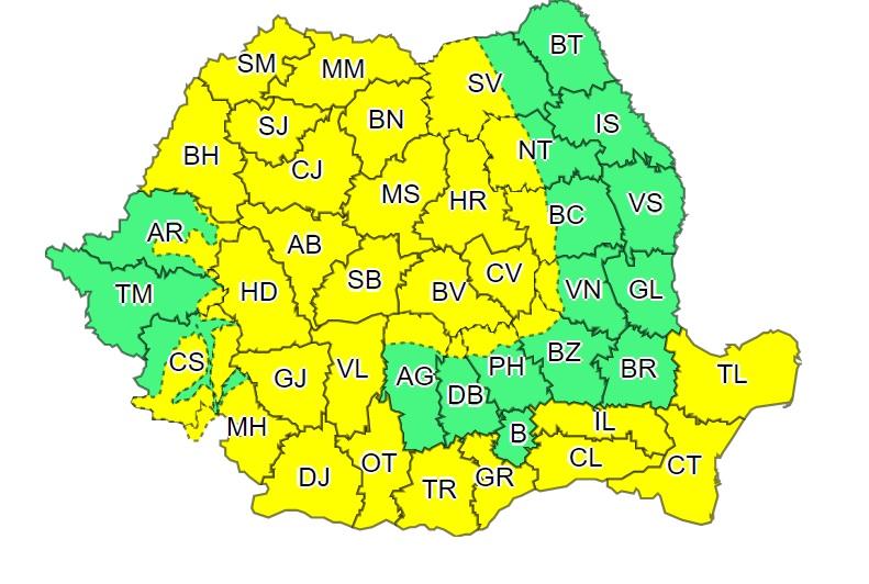 Administraţia Naţională de Meteorologie a emis, luni dimineaţă, două avertizări cod galben de vreme severă. Prima este valabilă până diseară, la ora 19.00, iar a doua este în vigoare până marți dimineață.