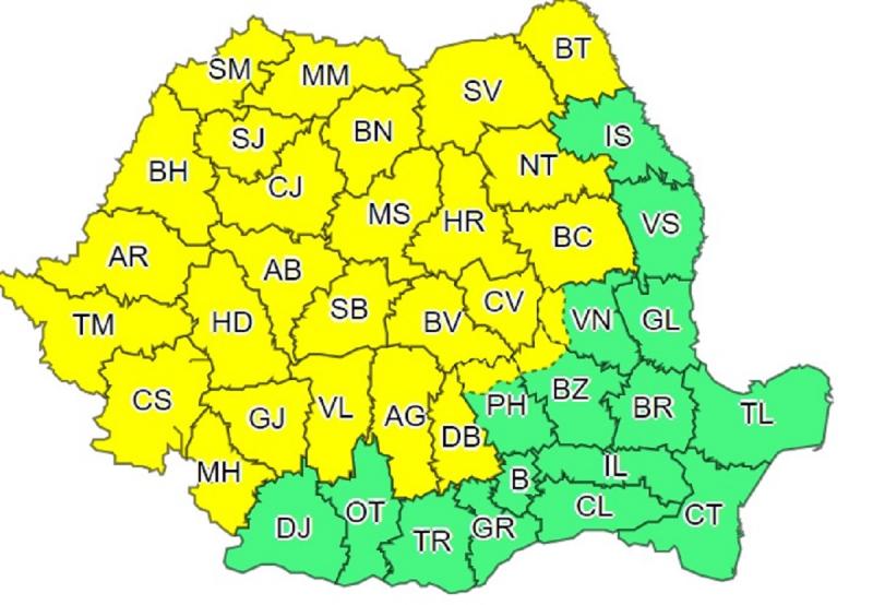 Alerta cod galben vizează județele: Satu Mare, Maramureș, Sălaj, Suceava, Bistrița-Năsăud, Neamț, Harghita, Mureș, Brașov, Covasna, Prahova, Dâmbovița, Argeș, Vâlcea, Mehedinți, Gorj, Sibiu, Alba, Cluj, Bihor, Arad, Timiș, Caraș Severin, Hunedoara , Botoșani, Bacău, Vrancea și Buzău.