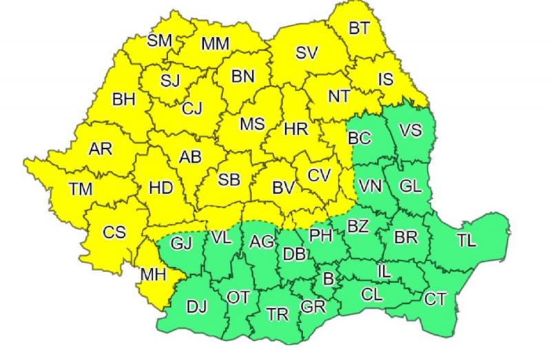 - Codul galben de ploi, vânt puternic și grindină este valabil în 29 de județe.