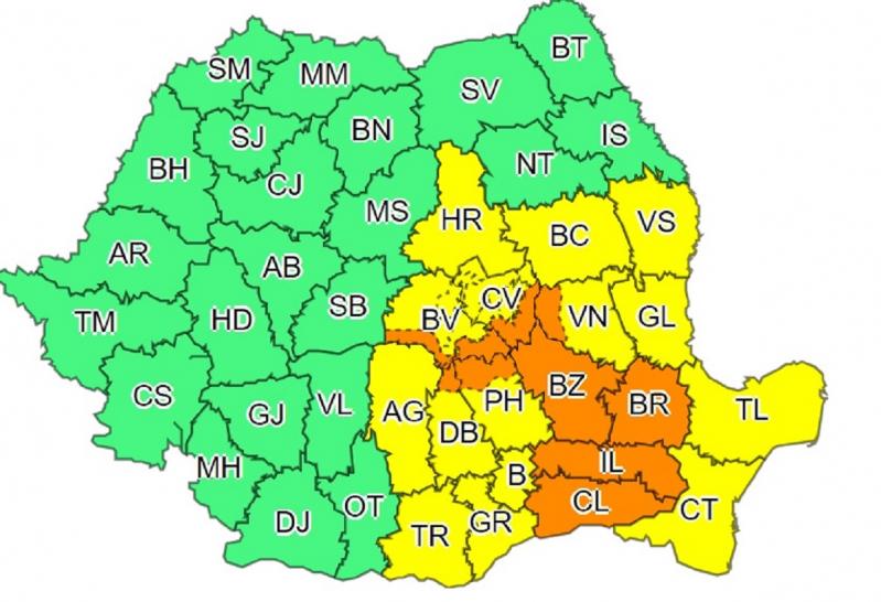 Vineri între orele 02.00 - 23.00, în județele Călărași, Ialomița, Brăila, Buzău, precum și în zona de munte a județelor Vrancea, Prahova, Brașov, Covasna și Dâmbovița, va fi cod portocaliu de instabilitate atmosferică accentuată, iar cantitățile de apă, în intervale scurte de timp sau prin acumulare, vor depăși 50...70 l/mp.