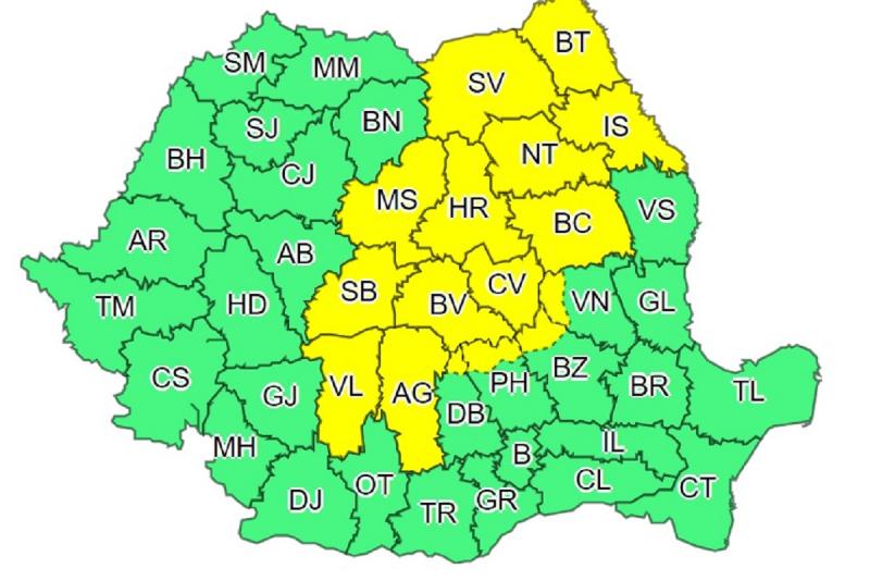 Joi între orele 12:00 - 21:00, în județele Suceava, Botoșani, Neamț, Iași, Bacău, Harghita, Mureș, Sibiu, Brașov, Covasna, Vrancea, Buzău, Prahova, Dâmbovița, Argeș și Vâlcea vor fi perioade cu instabilitate atmosferică accentuată ce se va manifesta prin averse, descărcări electrice, intensificări ale vântului, vijelii și grindină.