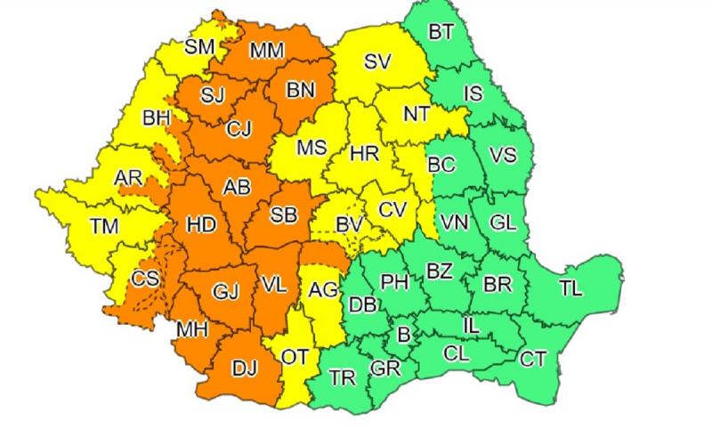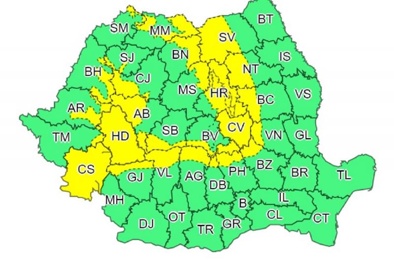 Începând de vineri, ora 14:00 până la ora 21:00, în zona montană a județelor Satu Mare, Maramureș, Sălaj, Suceava, Bistrița-Năsăud, Neamț, Harghita, Mureș, Brașov, Covasna, Prahova, Dâmbovița, Argeș, Vâlcea, Gorj, Sibiu, Alba, Cluj, Bihor, Arad, Timiș, Caraș Severin, Hunedoara, Bacău, Vrancea și Buzău va fi Cod galben de instabilitate atmosferică accentuată, ce se va manifesta prin averse, descărcări electrice și intensificări de scurtă durată ale vântului.