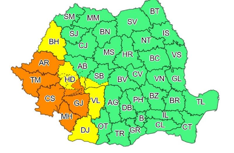 De vineri ora 23:00 până sâmbătă ora 9:00, județele Arad, Timiș, Caraș-Severin, Mehedinți, Gorj și Hunedoara ajung sub Cod portocaliu de ploi torențiale, iar cantitățile de apă vor depăși local 30...40 l/mp și, izolat, 50...60 l/mp.