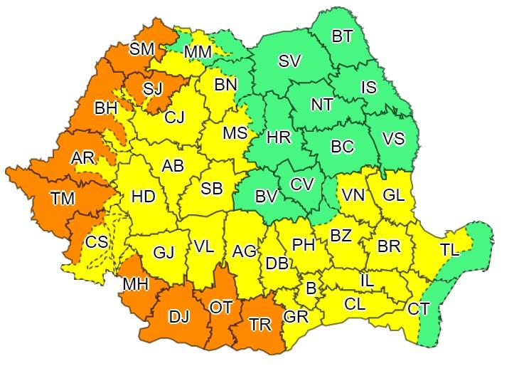 De asemenea, o avertizare cod portocaliu va fi în vigoare vineri și sâmbătă în județele Satu Mare, Sălaj, Bihor, Arad, Timiș, Caraș-Severin, Mehedinți, Dolj, Olt și Teleorman.