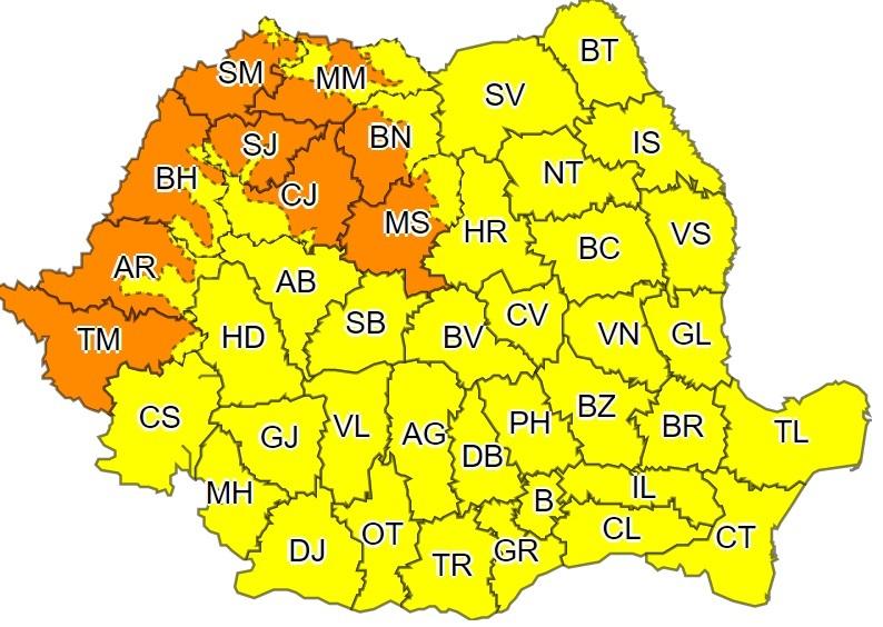 Harta județelor afectate de codurile galben și portocaliu
