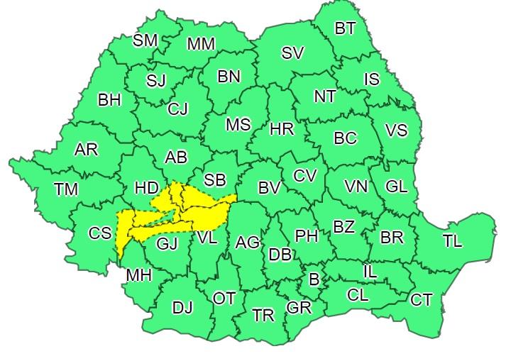 Potrivit ANM, în Carpații Meridionali este în vigoare de duminică, de la ora 20.00, până luni, la ora 8.00, o avertizare cod galben. În aceste zone, la altitudini de peste 1700 de metri va ninge, se va depune strat de zăpadă, iar vântul va avea intensificări cu viteze ce vor depăși la rafală 70-80 km/h, viscolind ninsoarea și spulberând zăpada.