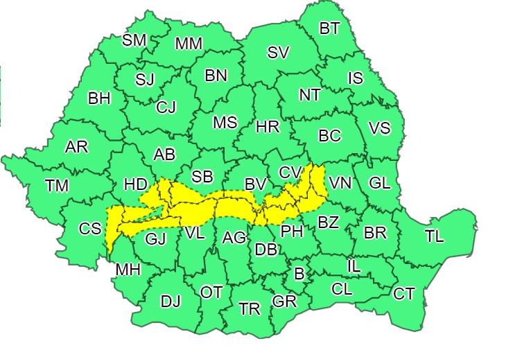 ANM a emis şi un cod portocaliu de viscol puternic la altitudini de peste 1.600 de metri, în Carpaţii Meridionali şi de Curbură, valabil tot marţi, între orele 11.00 – 20.00. Totodată, începând de marţi seară, de la ora 20.00, până miercuri, la ora 18.00, este cod galben.